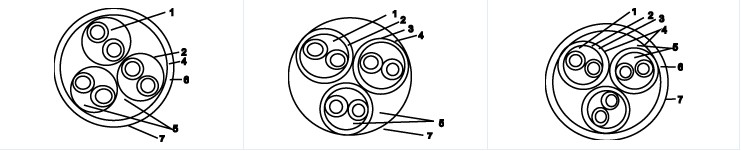 1、對絞線組 2、隔離層 3、對屏蔽 4、隔離層 5、填充 6、總屏蔽 7、隔離層外護套